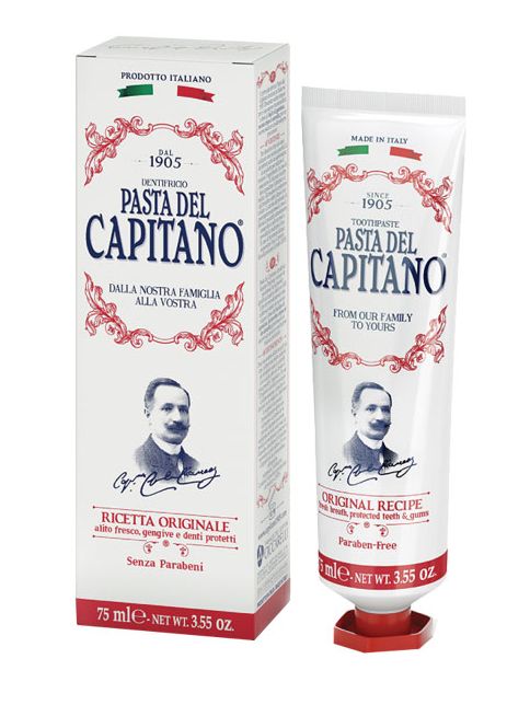 Зубная паста Оригинальный рецепт. Первая Pasta del Capitano, выпущенная в Италии в 1905 году, сразу стала известна из-за своего уникального аромата листьев гвоздики, мяты и корицы, позволяющего всегда иметь ароматное дыхание и уверенную улыбку.